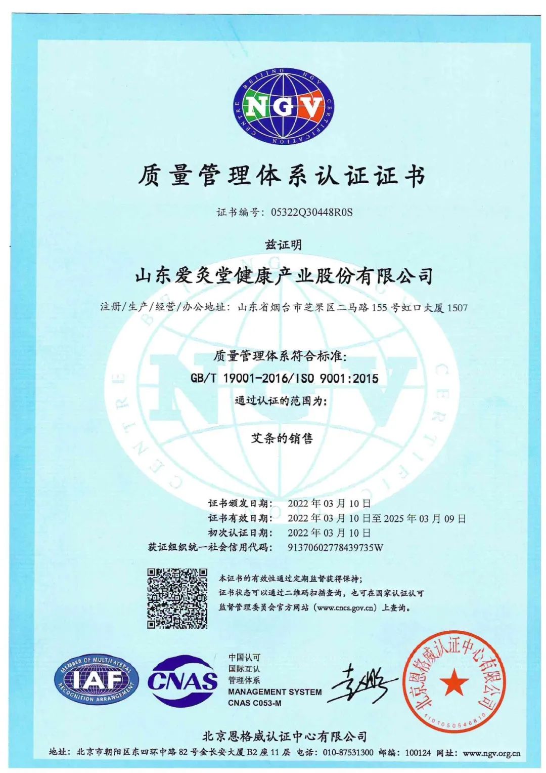 山東愛灸堂健康產(chǎn)業(yè)股份有限公司(以下簡稱“愛灸堂”)順利通過了質(zhì)量認(rèn)證中心的專項(xiàng)審核,正式獲得ISO 9001:2015質(zhì)量管理體系認(rèn)證證書,這標(biāo)志愛灸堂在程序化和標(biāo)準(zhǔn)化方面取得了新的進(jìn)展。
